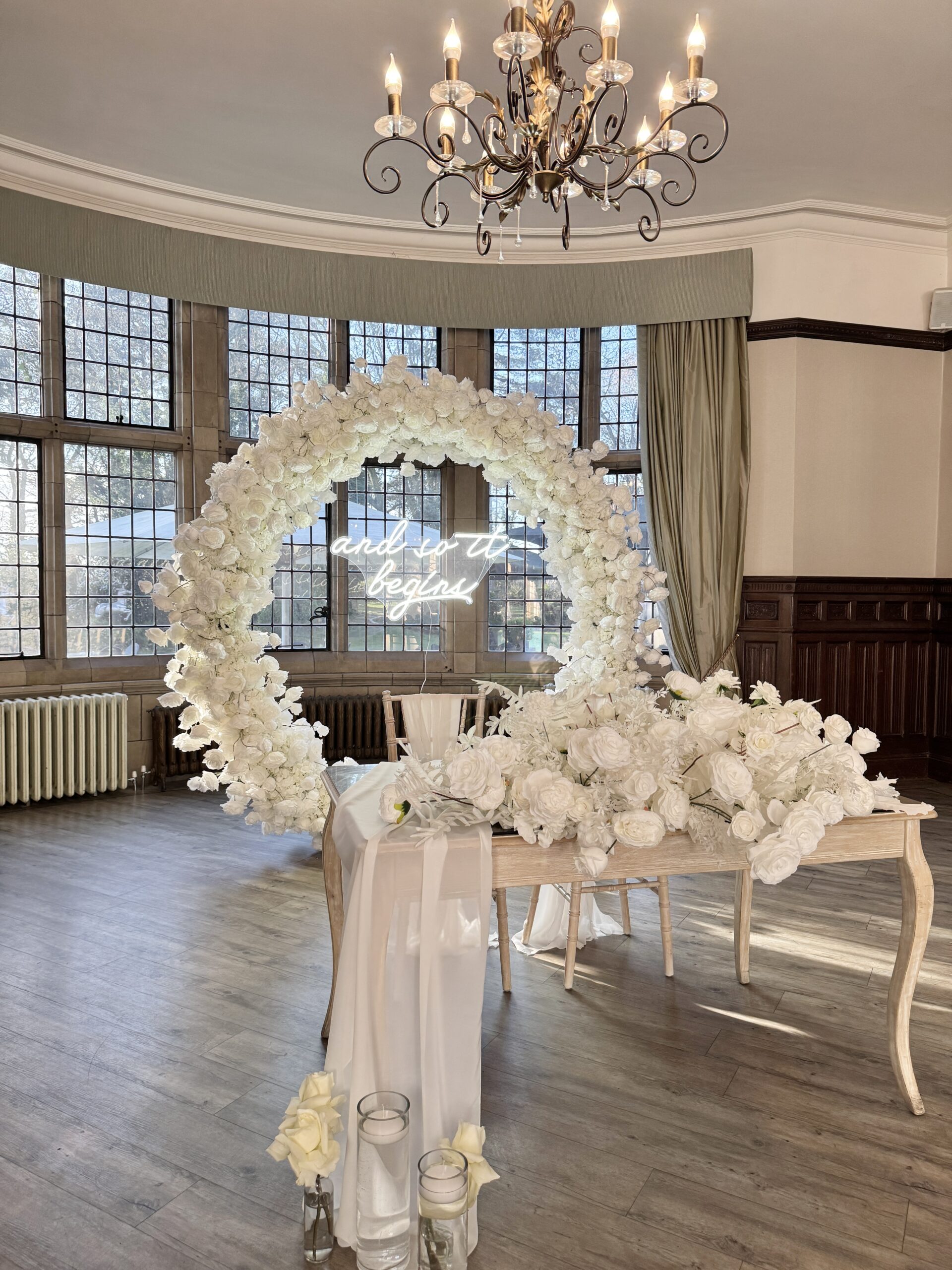 100cm wide, packed full of a HUGE array of stunning white silk florals, perfect for classic white or even monochrome wedding themes.