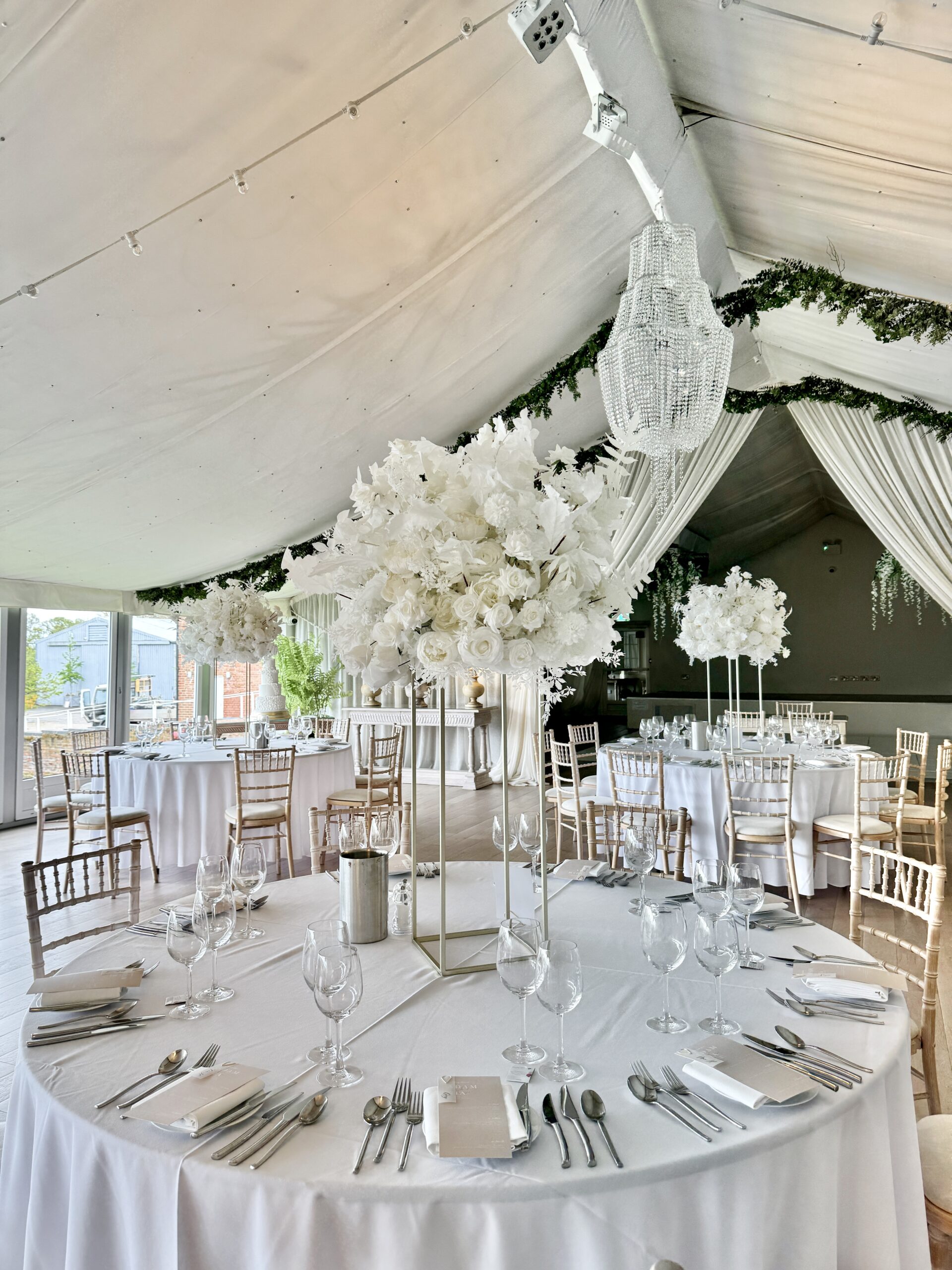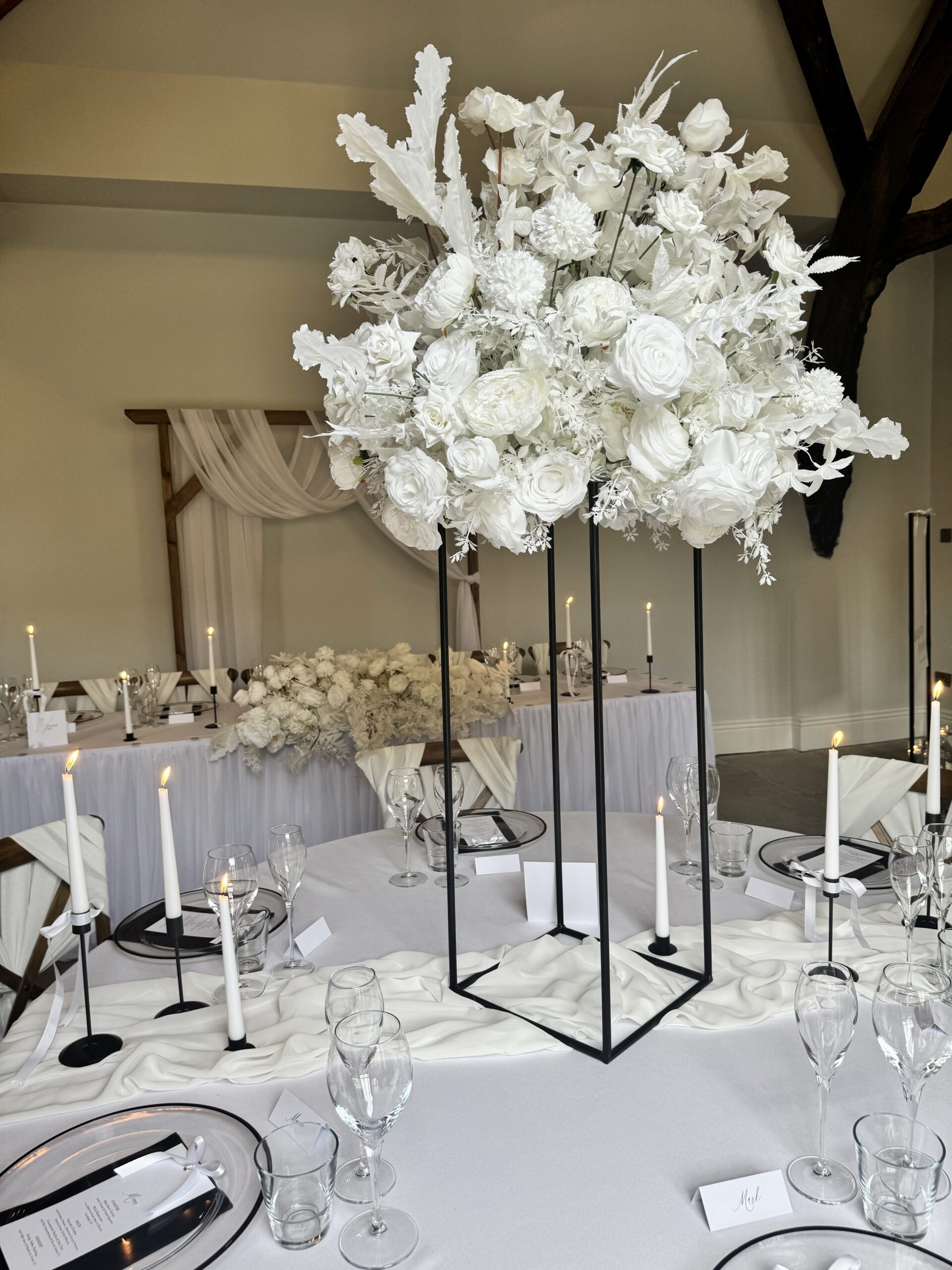 60cm wide, packed full of a HUGE array of stunning white silk florals, perfect for classic white or even monochrome wedding themes.