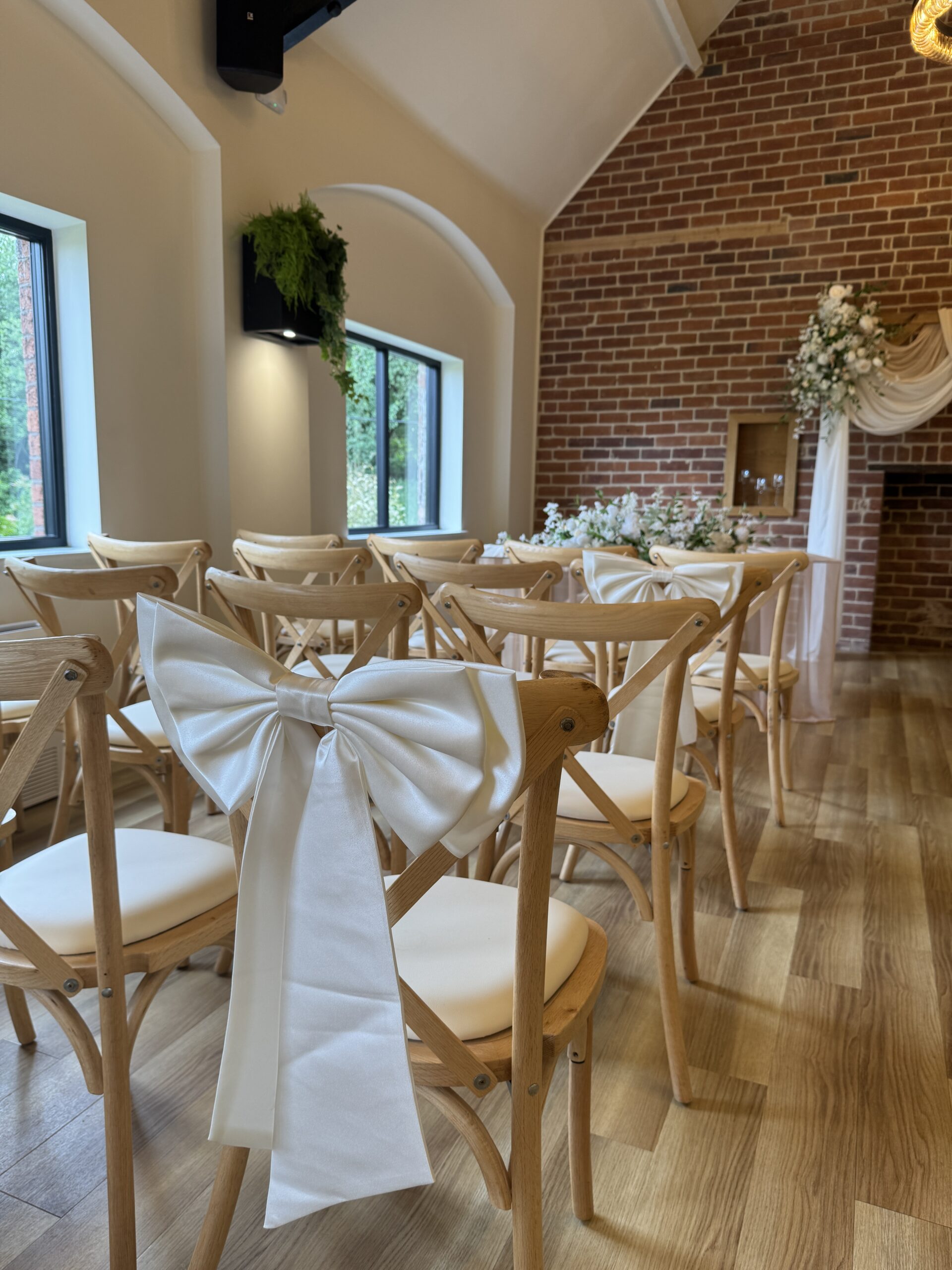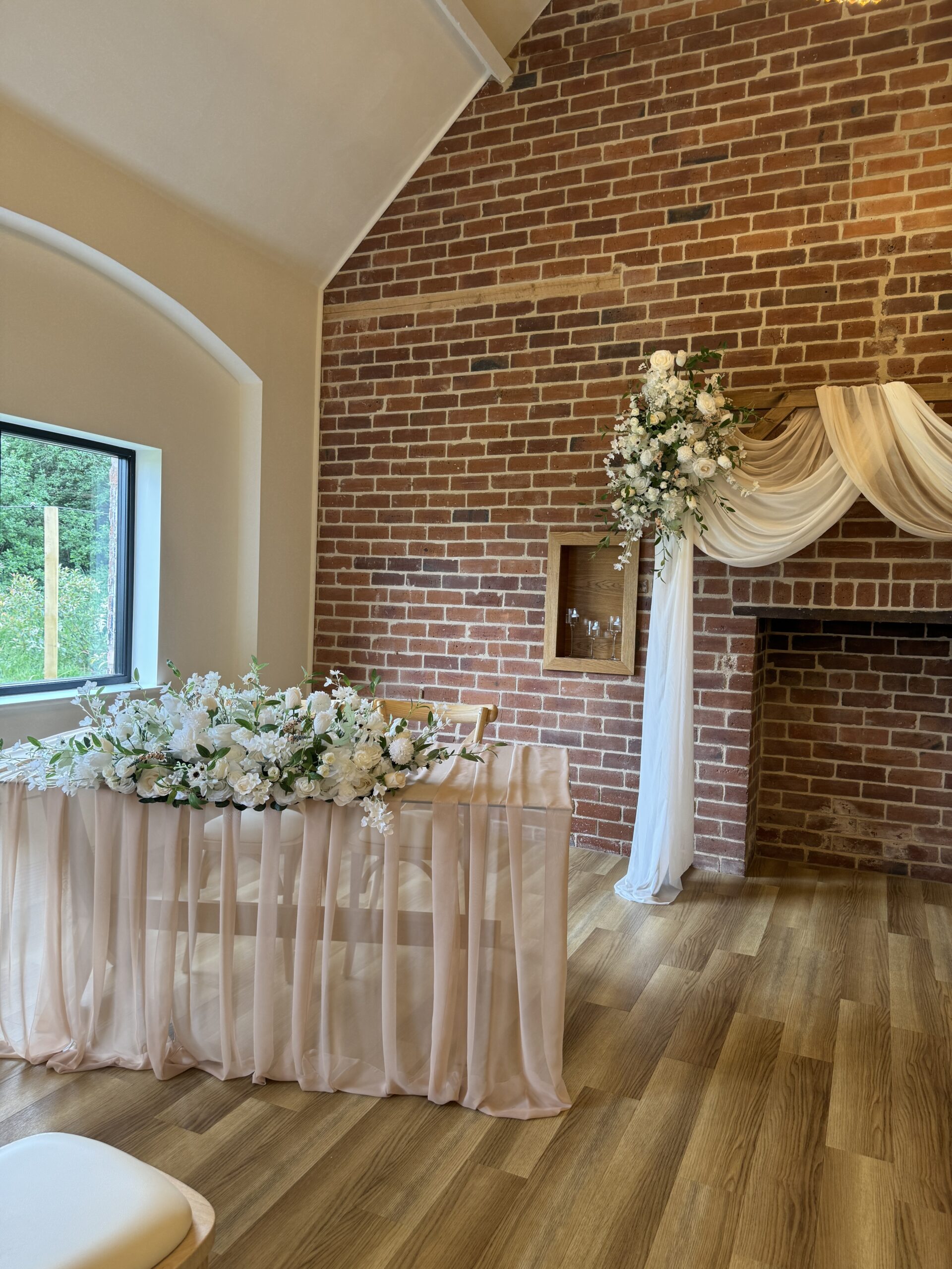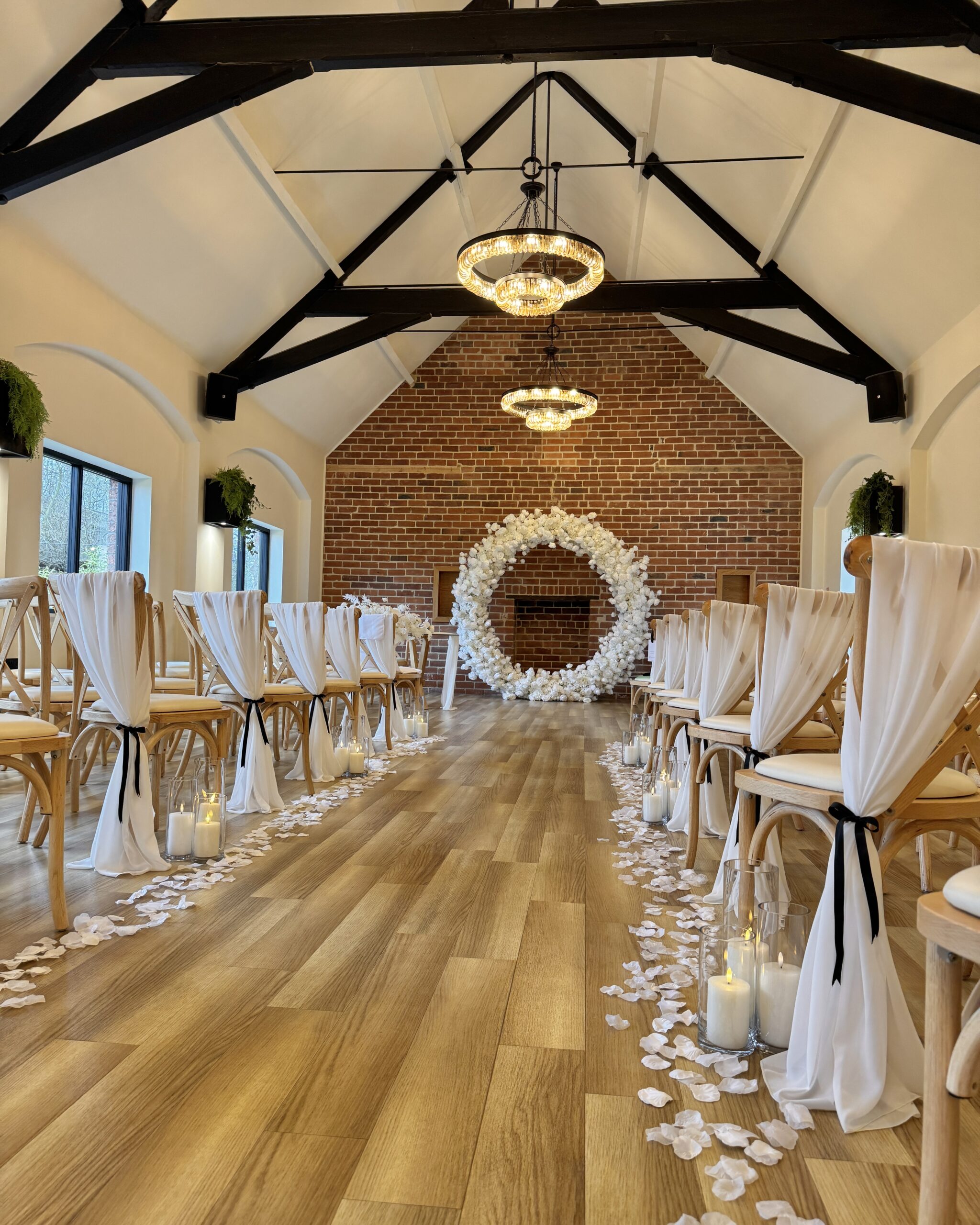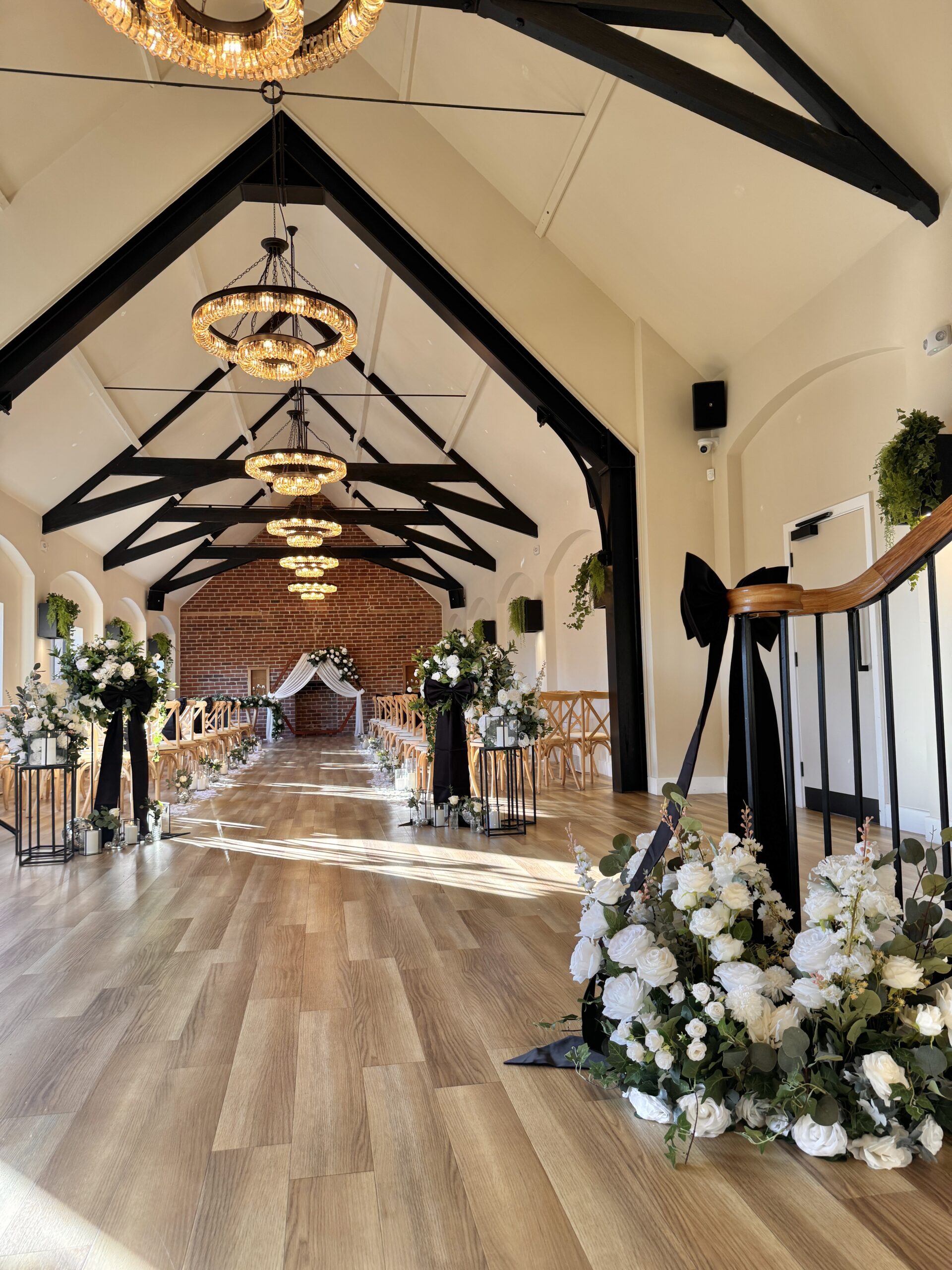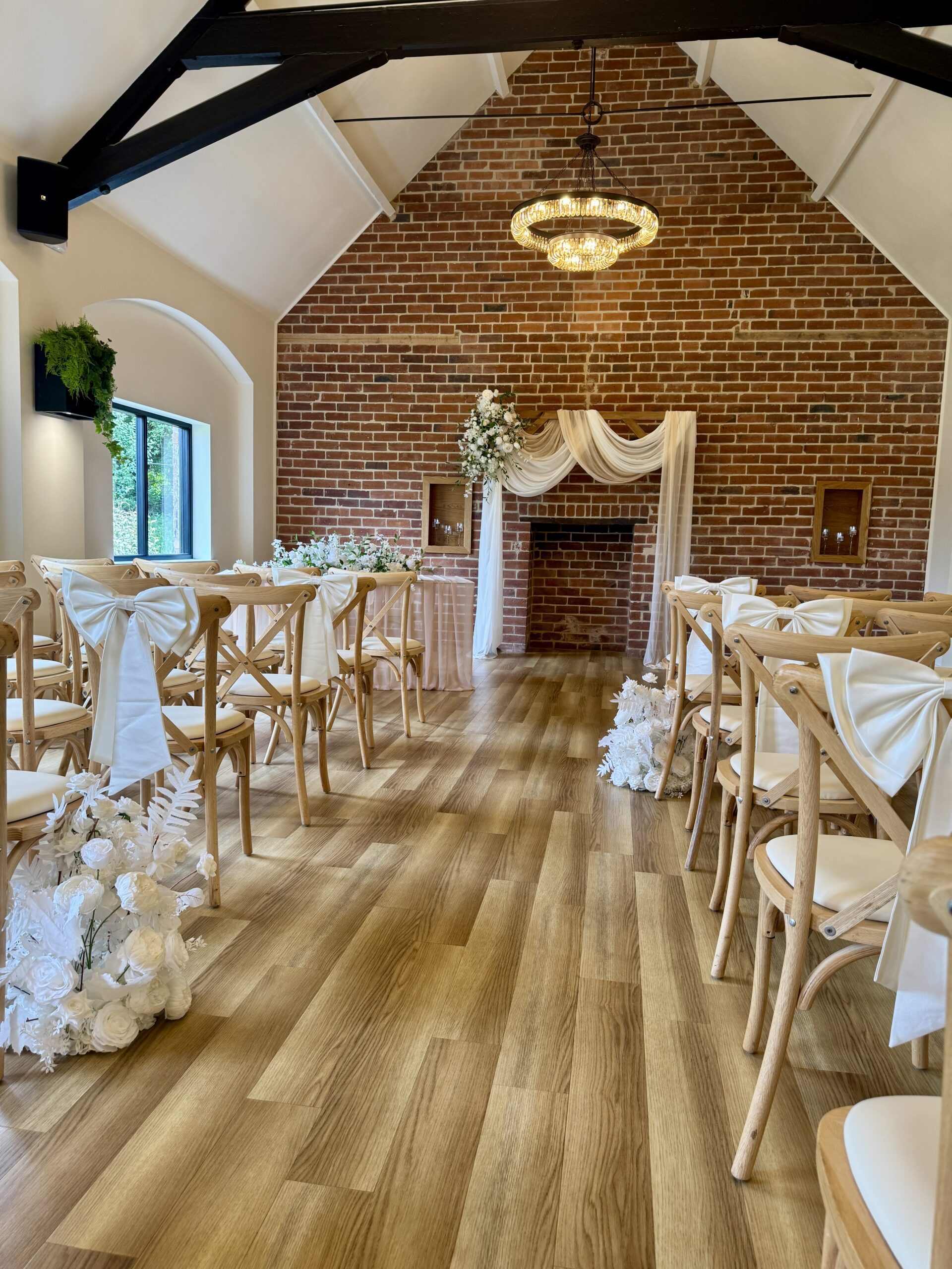 As wedding stylists, we love how the Ceremony Barn allows couples to completely personalise their ceremony. Whether you’re dreaming of a floral-lined aisle, a statement ceremony backdrop or subtle, thoughtfully placed details that elevate the space, this barn lends itself beautifully to bespoke styling. Against the vast rustic brick wall, a ceremony Arch / Moongate or Backdrop is a perfect focal point to be married in front of, and the ceremony table can hold any of our table arrangements – whether it be foliage or beautiful floral display! The table itself looks stunning with fabric table runners, full table fabric pleating or even left as it is. Aisle chairs dressed with drapes are a great way to frame your ‘runway’, and you can choose to add thoughtful details such as floral pieces, floral floor displays, LED candles or even simple white petals. With the large floor area at the start of the aisle, you even have the option of framing the aisle with plinths, florals, candles (or even disco balls!) – each element creating your own perfect ceremony.