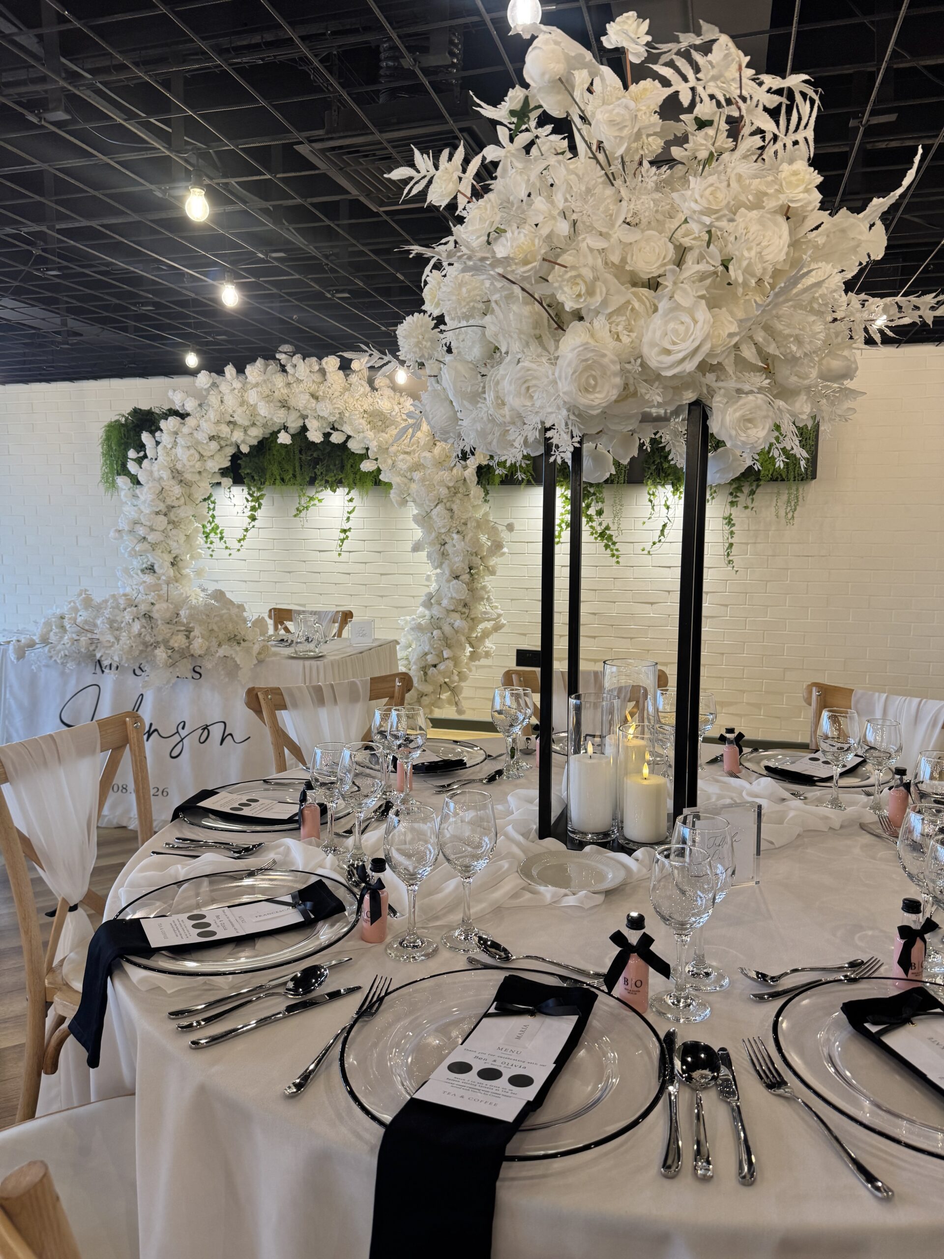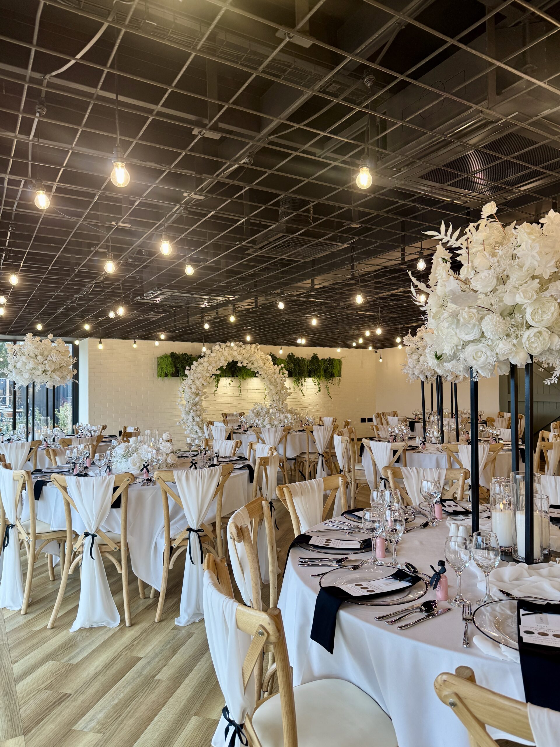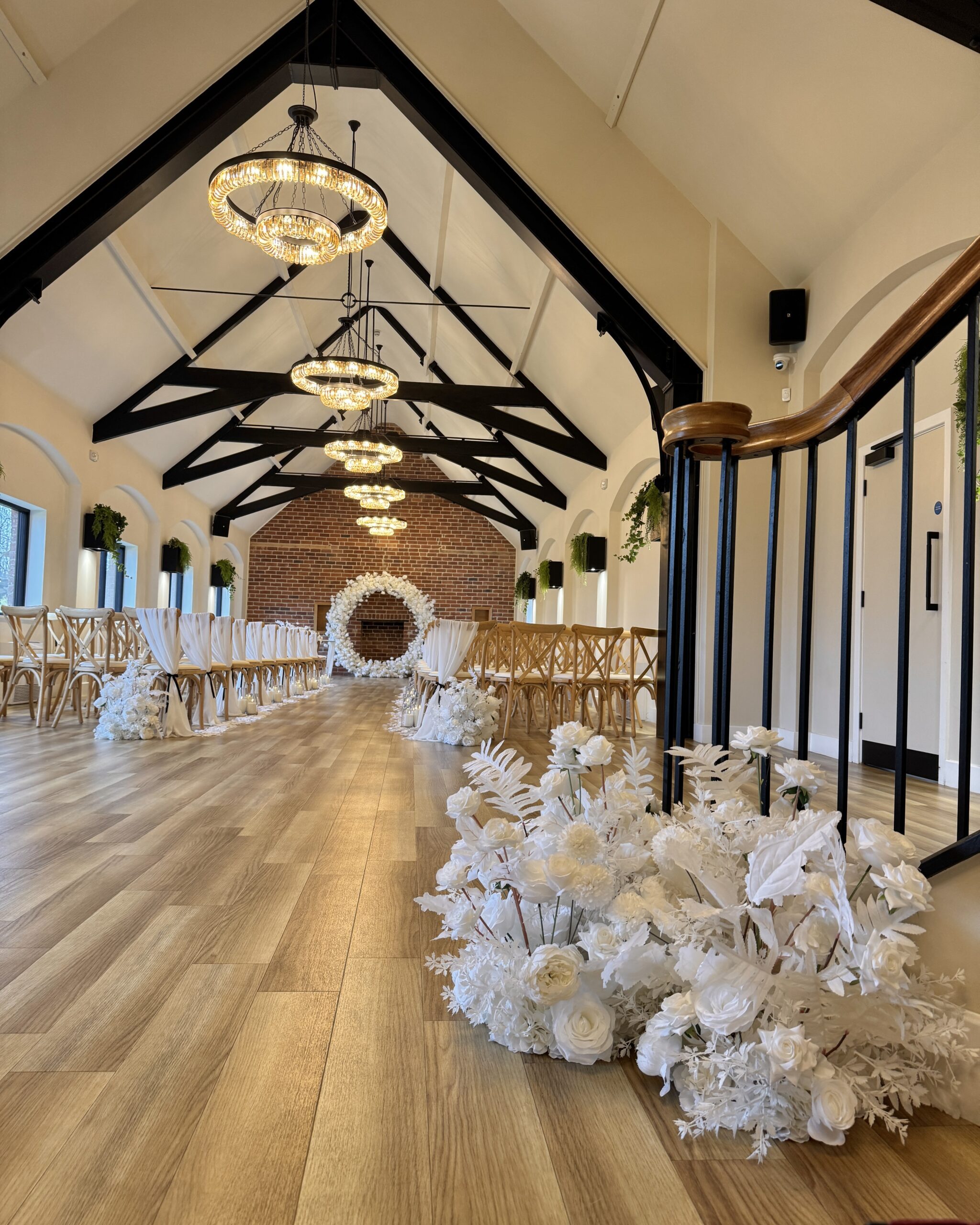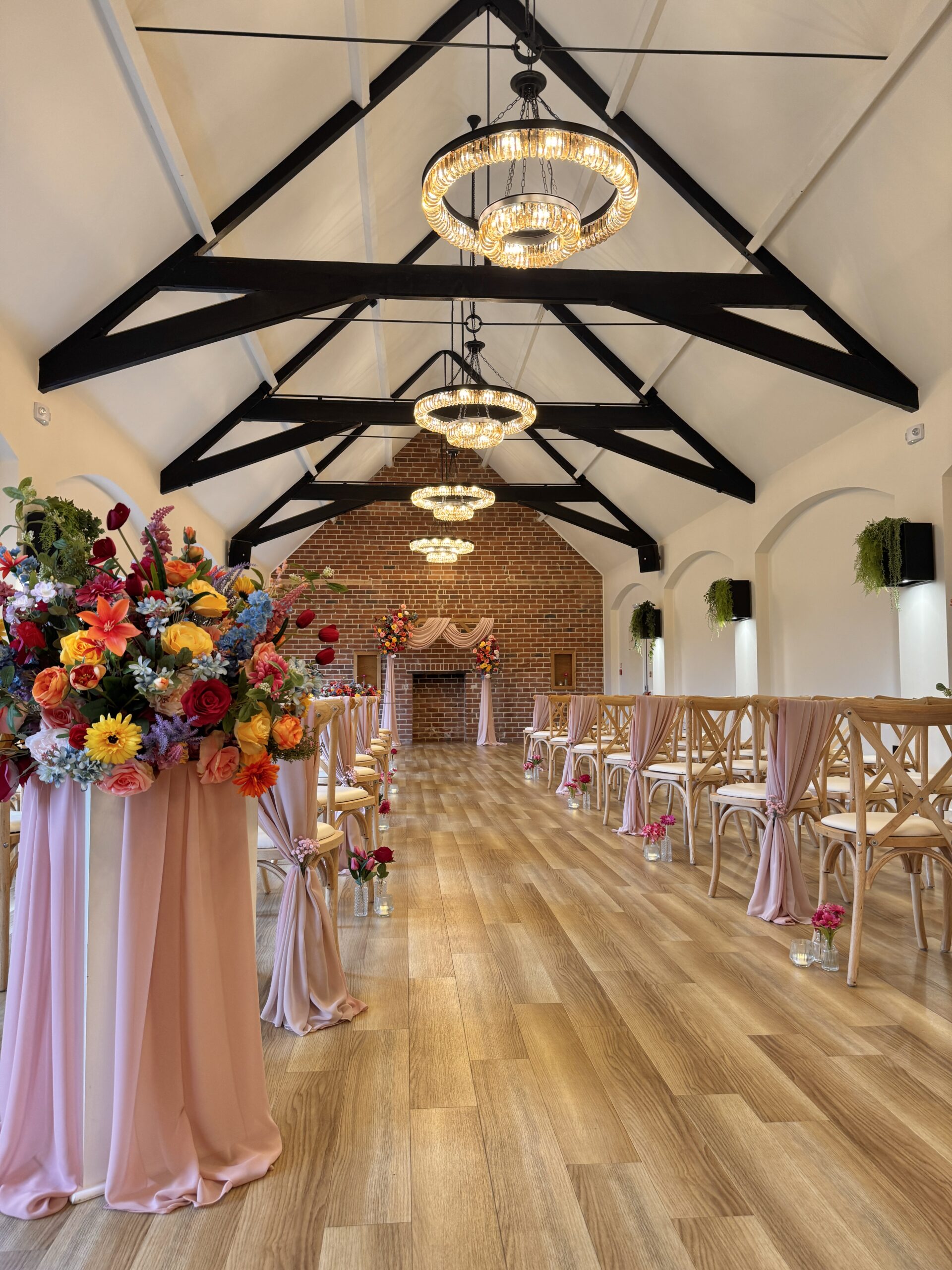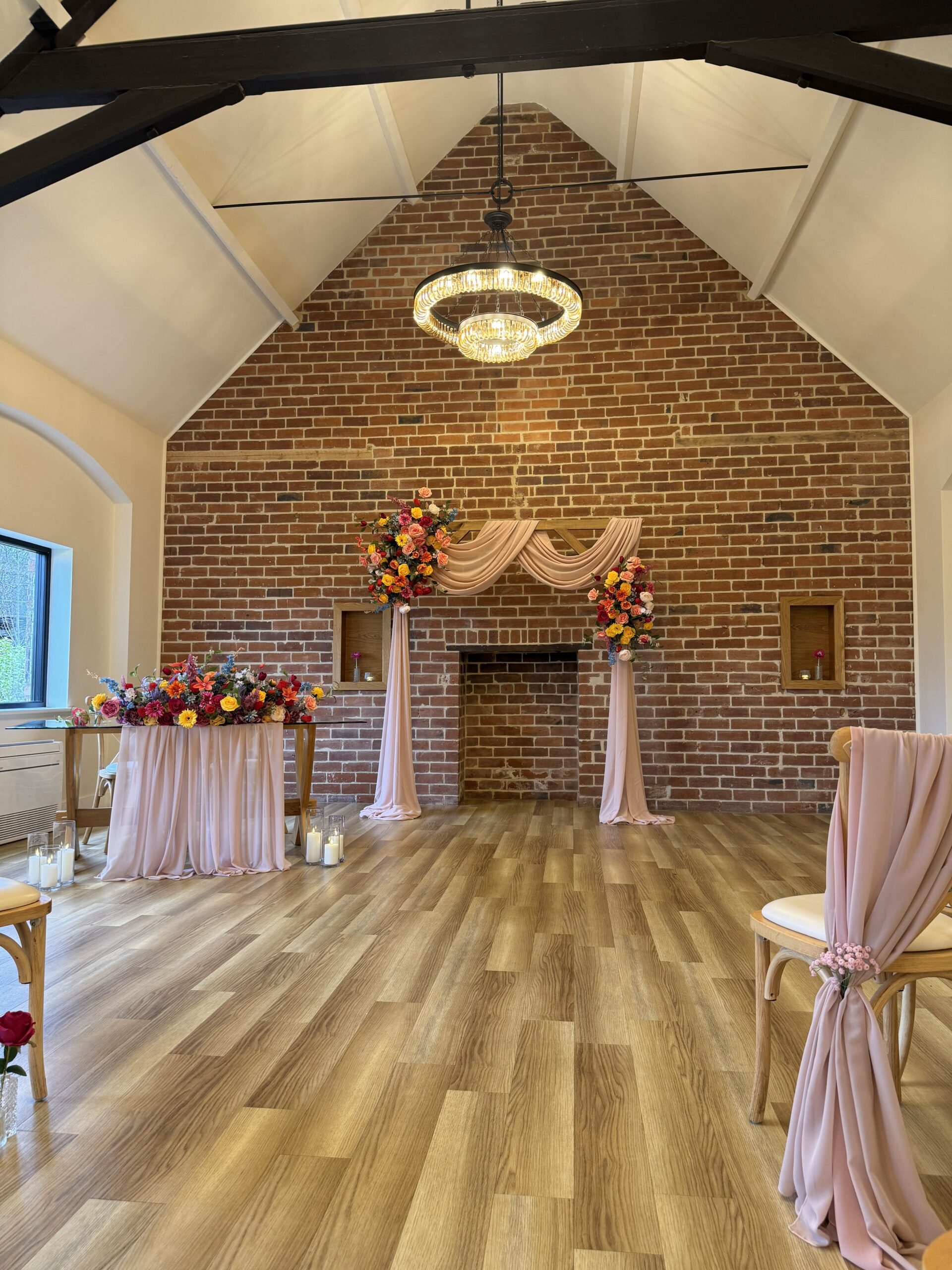 As wedding stylists, we love how the Ceremony Barn allows couples to completely personalise their ceremony. Whether you’re dreaming of a floral-lined aisle, a statement ceremony backdrop or subtle, thoughtfully placed details that elevate the space, this barn lends itself beautifully to bespoke styling. Against the vast rustic brick wall, a ceremony Arch / Moongate or Backdrop is a perfect focal point to be married in front of, and the ceremony table can hold any of our table arrangements – whether it be foliage or beautiful floral display! The table itself looks stunning with fabric table runners, full table fabric pleating or even left as it is. Aisle chairs dressed with drapes are a great way to frame your ‘runway’, and you can choose to add thoughtful details such as floral pieces, floral floor displays, LED candles or even simple white petals. With the large floor area at the start of the aisle, you even have the option of framing the aisle with plinths, florals, candles (or even disco balls!) – each element creating your own perfect ceremony.
